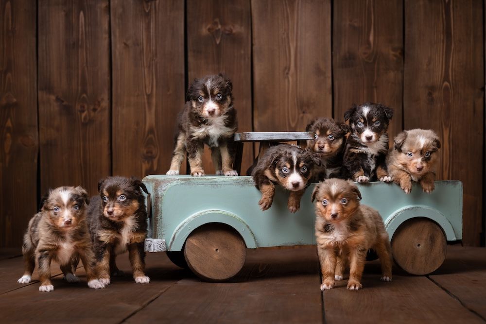 Unvergessliches Welpenshooting im Landatelier: Wurfbegleitung mit 9 Mini Aussies von den Glitzerpfötchen
